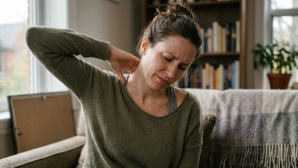 Hours at a laptop, looking down at a phone, driving with rounded shoulders, sitting in a chair that doesn’t support your upper back – all of these put the rhomboid muscles (which run from your spine to your shoulder blades) under constant, low-level strain. Over time, they fatigue, tighten, and start referring a dull, burning ache across the upper back.